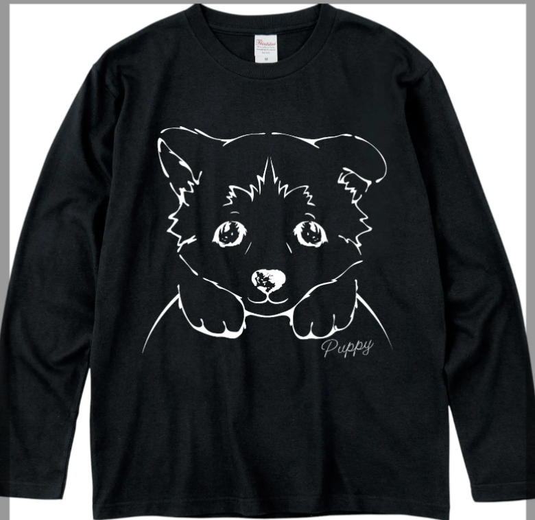 胸元に大きく描かれた可愛いワンちゃんの線画イラストが印象的な、黒の長袖Tシャツです。