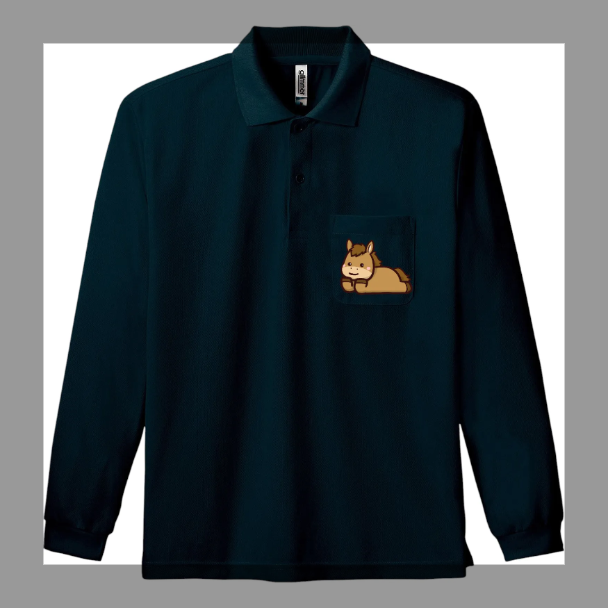 胸元ポケットうまイラスト/馬/ポケット/Tシャツ/長袖/かわいい/イラスト/おしゃれ/メンズ/レディース/オリジナルデザイン/00335-ALP/ glimmer4.4オンス ドライ長袖ポロシャツ(ポケット付き)/ブラック