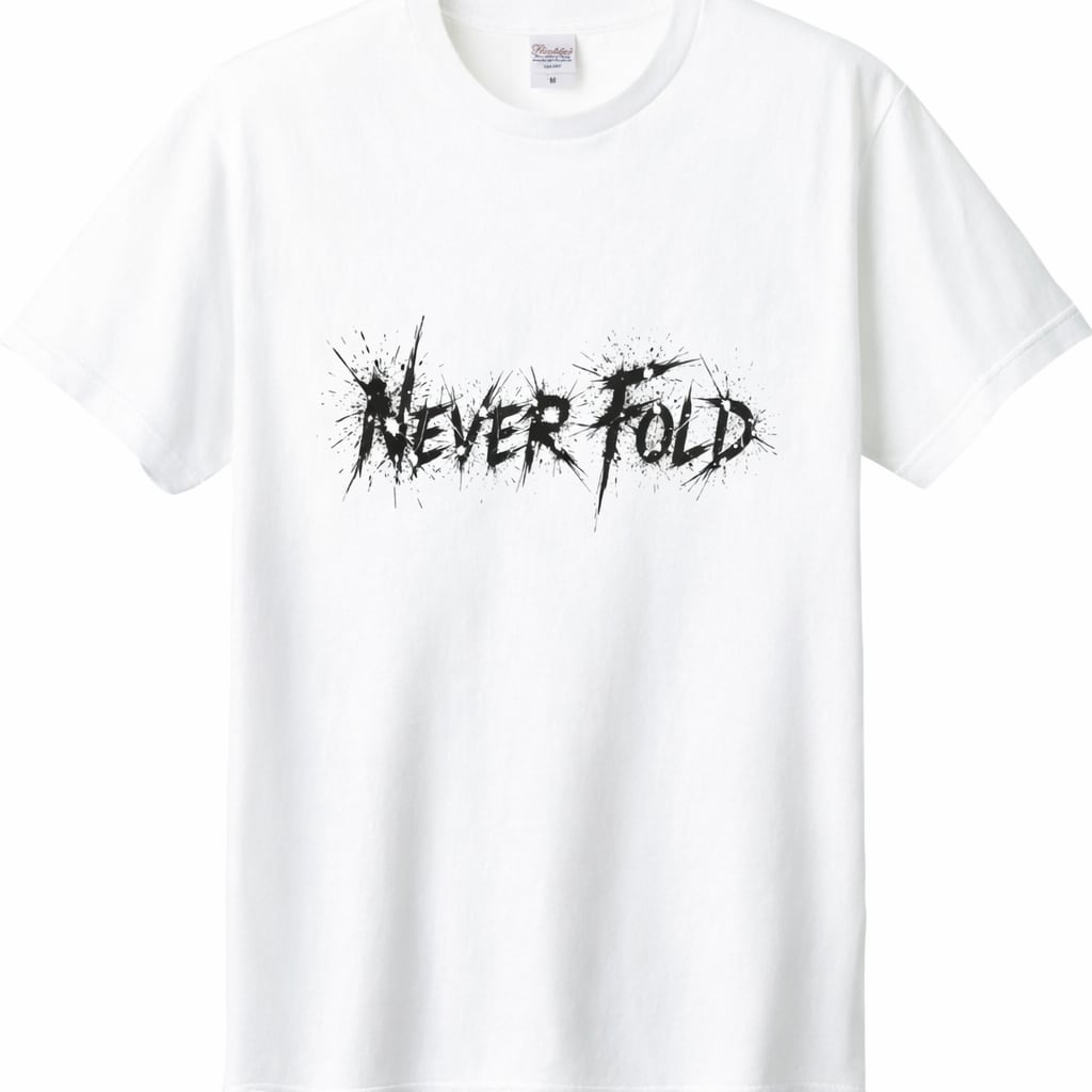 NEVER FOLD(決して折れない)のメッセージを、荒々しいグランジ調の英字デザインで表現したストリート系Tシャツです。